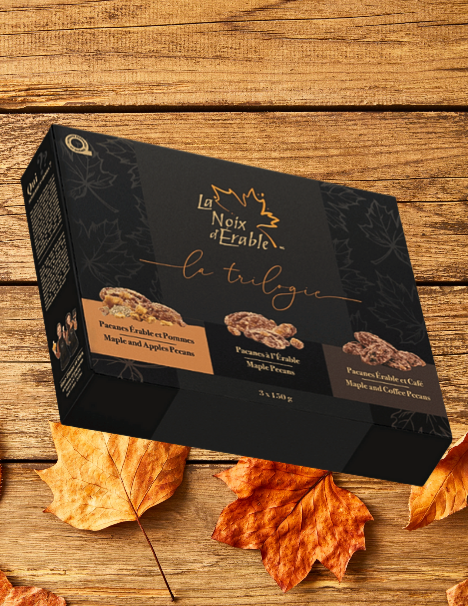 « Ça, c’est juste…écoeurant! », s’est exclamé le chanceux qui y a goûté pour la première fois. C’est ainsi qu’est née La Noix d’Érable, et depuis, notre passion ne cesse de grandir. Notre boîte trilogie vous propose nos trois sublimes créations. Les Pacanes à l’Érable combinent la douceur et le mariage parfait entre la pacane et l’érable. Les Pacanes Érable et Café unissent à merveille l’arôme du café fraîchement moulu et nos pacanes. Enfin, les Pacanes Érable et Pommes offrent un mélange gourmand de pommes, cannelle et graines de citrouille, enrobé de sirop d’érable. Réalisées avec les coulées d’exception de notre érablière familiale, nos créations sont le fruit de notre amour et de notre savoir-faire. On vous met au défi de ne pas ouvrir les trois sacs...!
