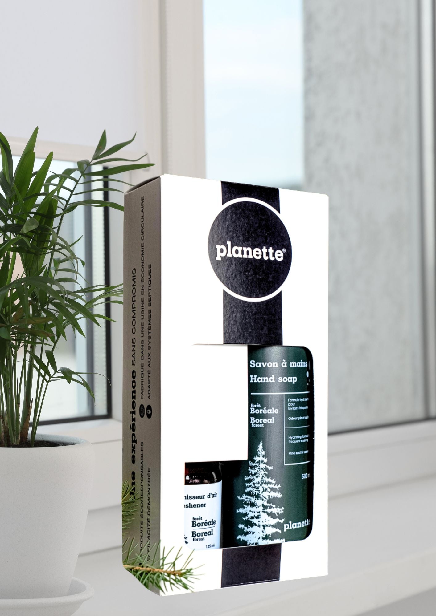 Cet ensemble réunit deux produits Planette à l’odeur envoûtante de sapin baumier et pin bois — une fragrance fraîche, apaisante et 100 % naturelle qui rappelle la forêt québécoise.