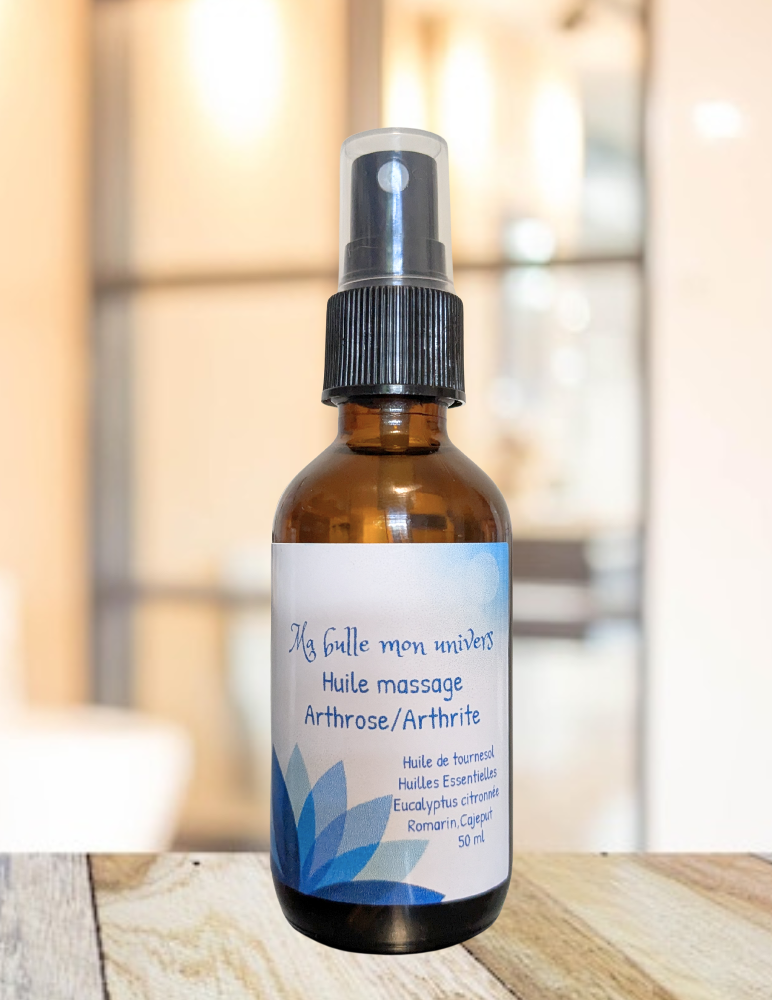 L' huile à massage contient de huile de tournesol pour sa facilité d'absorption , pour les problèmes au niveau des mains genoux chevilles je vous la conseille, plus faciles à utiliser que le baume